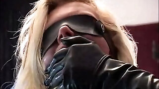 Super busty brunette in cock-squeezing latex dress bounds herself to the bed