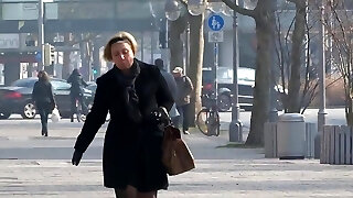 Lara Latex wearing high heels and nude stockings fingerblasting herself
