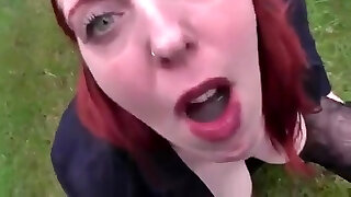Redhead Deutsch milf works that big cock with her bum and throat in the park