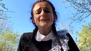 Whorish黑头发的青少年穿着大学制服,而Hotwife在她的男朋友和她的前夫
