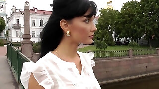 French guy caught an exhibitionist dark-haired and enticed her for MMF DP