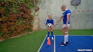 Bossy nymph coach uses a strap on dildo to fuck a sexy female soccer player