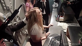 业余的金发女郎在皮带给口交,并采取BWC在她的阴部