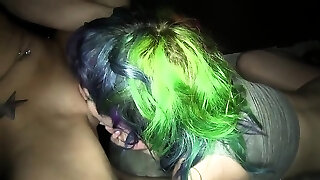 Dayna Vendetta去洗澡在一个加油站,而她的男朋友泵一些气体到面包车