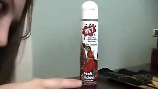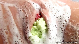 可爱的女性竹篙tucks她的阴唇与一些肥皂织物