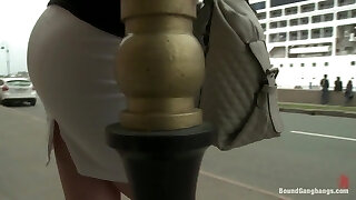 towheaded小鸡ambles在街上有假鸡鸡在她的臀部