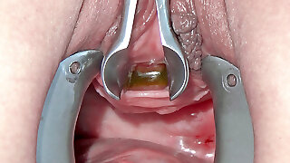 小便孔撕毁与牙刷和长长的金属链插入她的膀胱